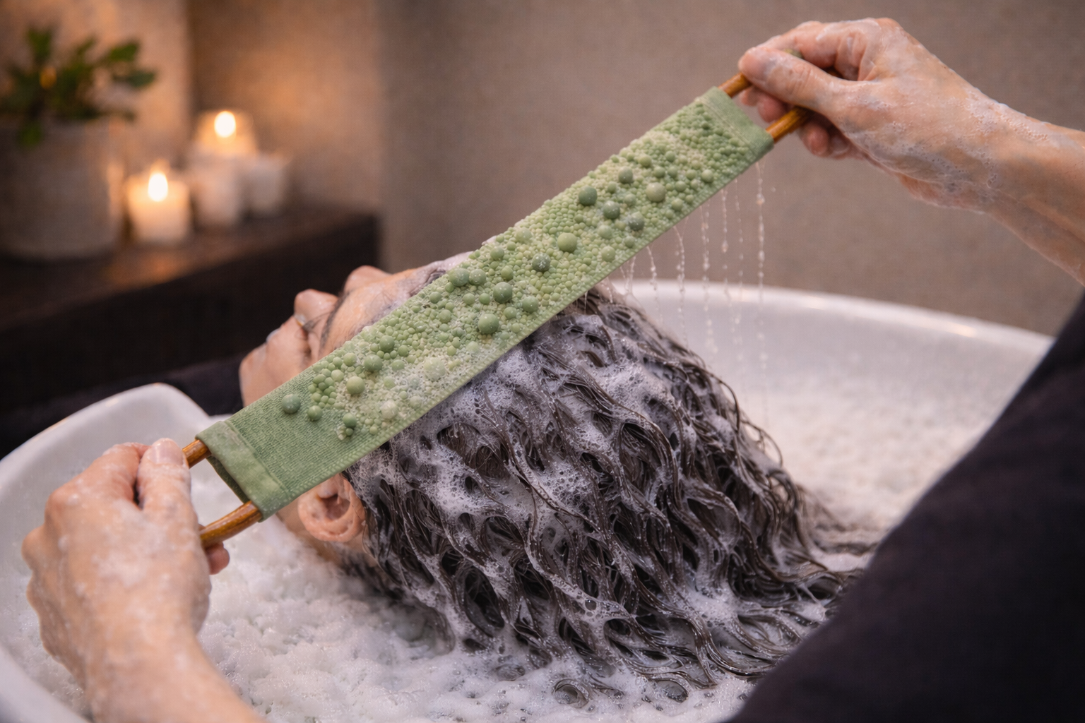 Una herramienta textil alargada, lavable y de lujo, diseñada para transformar el lavado del cabello en un ritual sensorial completo.