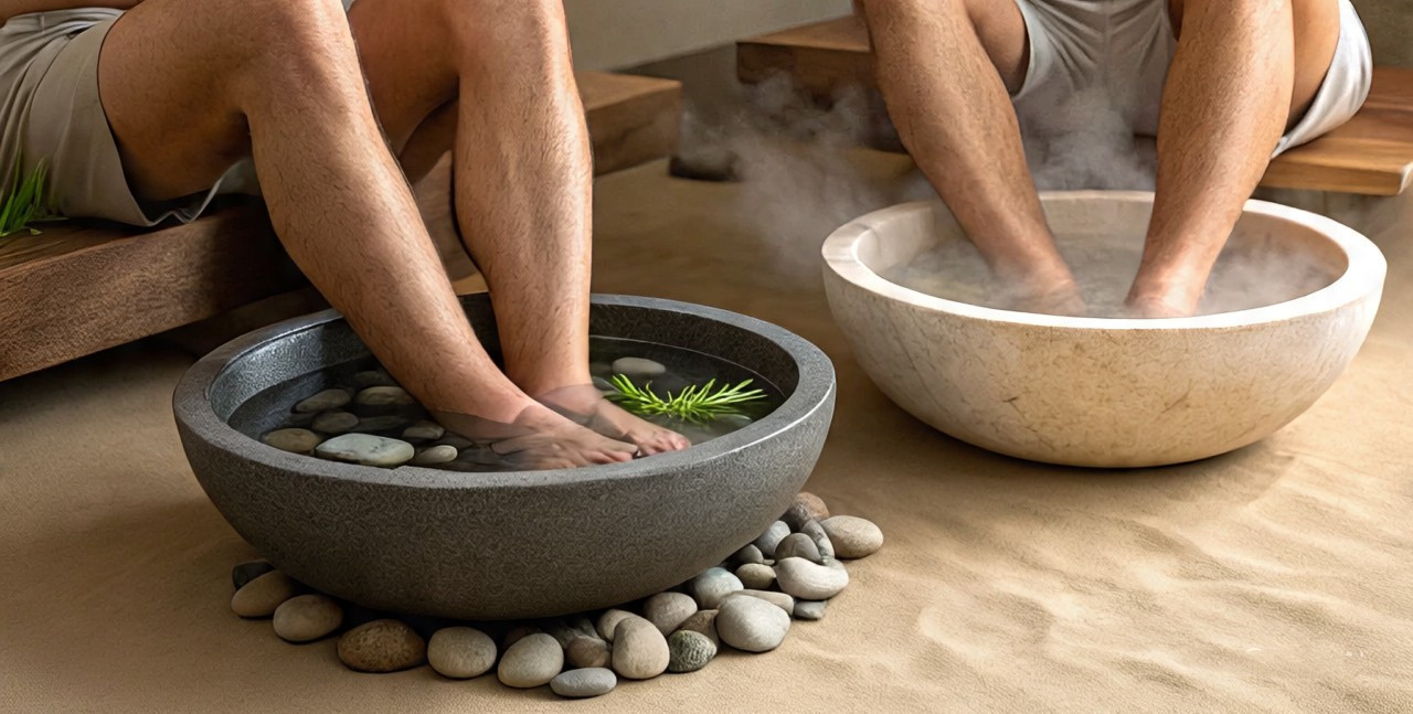 Agua tibia o caliente con plantas tradicionales y aceites naturales, infusión botánica inspirada en antiguos baños de bienestar.