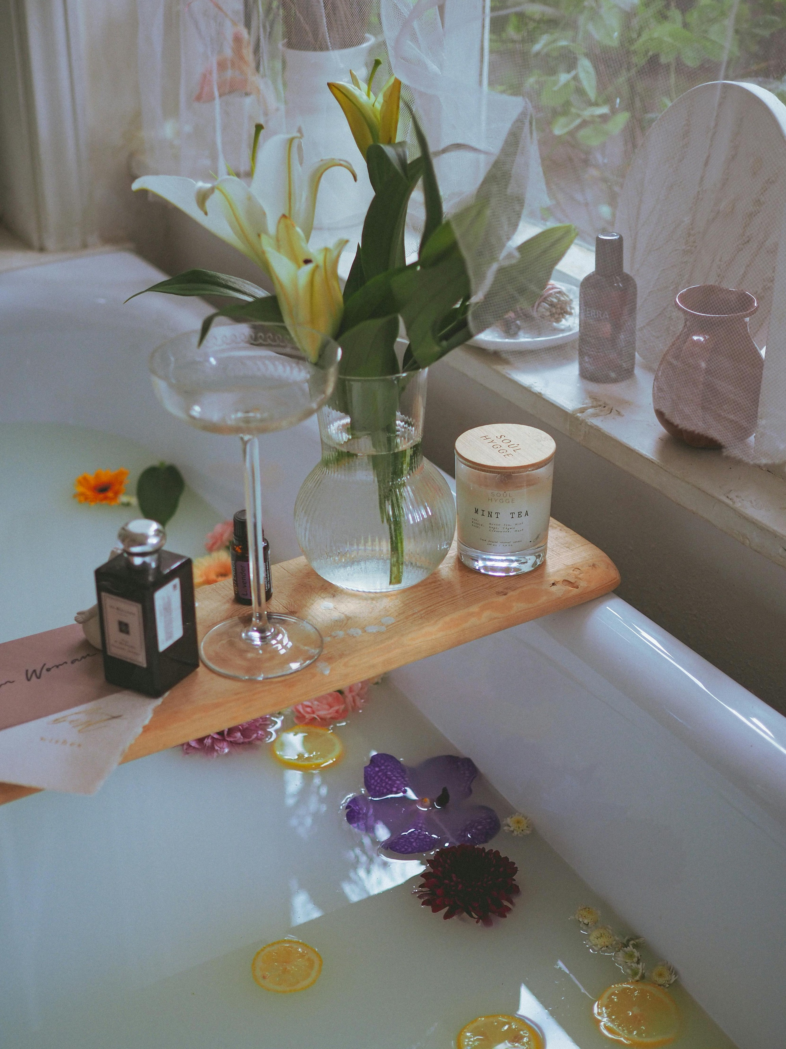 Un baño floral y delicado con pétalos naturales, aceites ligeros y sales purificantes.